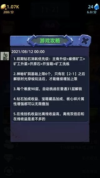 首冲(12元)——获得100%钻石收益,即钻石翻倍。钻石是这个游戏的核心货币,帮助你升级主角、合成宝石、雇佣矿工、矿工升星、开宝箱、矿工洗点。其实后面4项开支都是小头,主要大头就是升级主角,拿到钻石就升级主角,主角越厉害、队伍就越厉害、挂机效益越高。