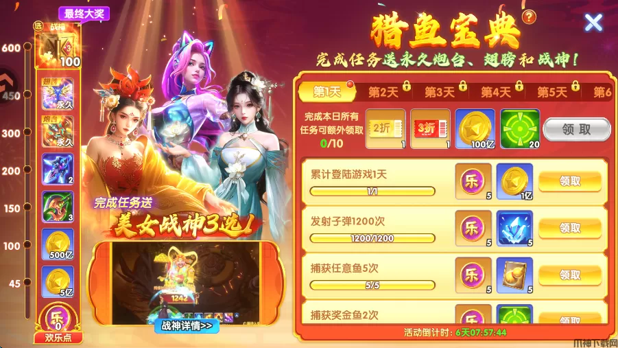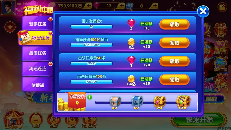1、在“猎鱼宝典”中,玩家可以通过完成每日的任务获得活跃点,在过程中可以获得大量的金币,最后还可以获得永久炮台,翅膀,以及战神。