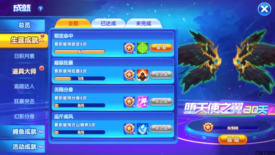 2、使用道具,捕捉鱼类,消耗金币等等方式都可以获得成就,而成就也可以获得丰厚的金币和道具奖励。