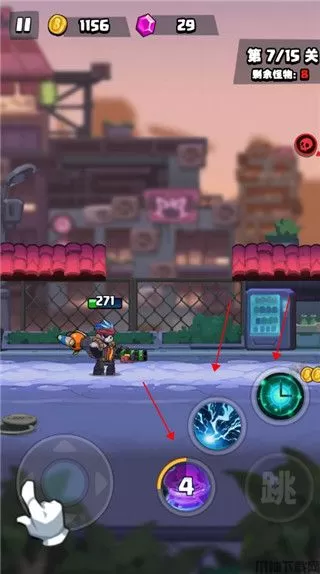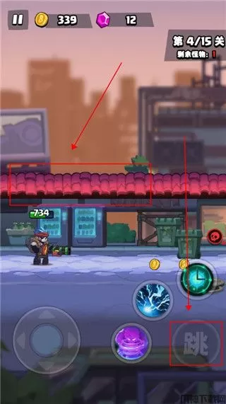 3、右下角的跳跃键则是可以让我们跳跃到高台上,躲避敌人的攻击。