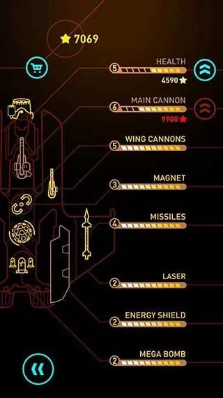4、升级你的护盾、主炮、导弹、激光、超级炸弹还有磁铁。