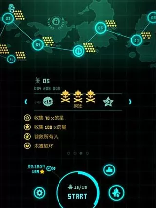 再次,来说说飞机属性和驾驶员的属性,飞机一共9种,效果分别是普通,救人快,射的快但是射的短,主武器+10%伤害,加血减速度,加速度减血,火力最大,幸运星,导弹分裂。其中前期推荐使用加血减速度的绿飞机,我通关一直用的它,刷碎片推荐幸运星,然后后期推荐导弹分裂,十分好用。驾驶员是需要成就获得的钻石来解锁的,第一个驾驶员是使一个随机的箱子里面充满100左右的星星,数量我没确定过具体多少,第二个是多一次防护罩,在你掉血前抵挡一次伤害,注意,对只能承受一次攻击的飞机无效,第三个是自动释放超级武器,根据你飞机身处的环境自动释放护盾,激光,核弹各一次,第四个也是幸运星,增加各种幸运,简单的说就是几率触发的变成必定触发,箱子里面更容易出货,第五个是减慢敌人的子弹速度,无伤很简单。后面的暂时还没有开启,等开了之后再补足。