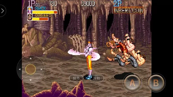 3、进入关卡,操控这名角色进行闯关,左边控制移动方向,右侧A键是出拳/抬起,B是跳跃。