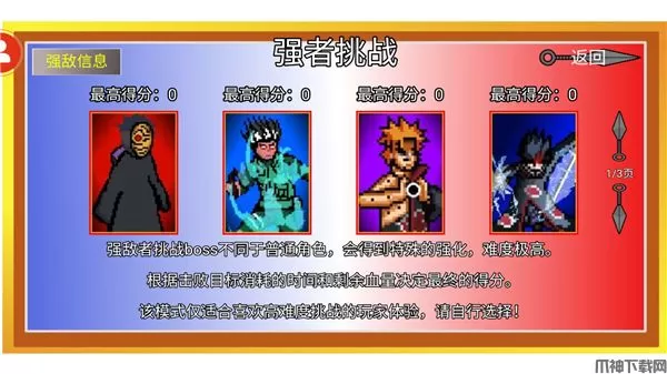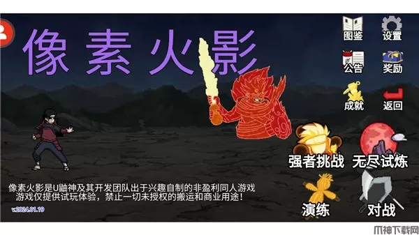 2、采用2D像素格斗形式,画面精美,动作流畅。每个角色的动作和技能释放都非常细致,完美呈现了火影忍者中的经典场景和角色。