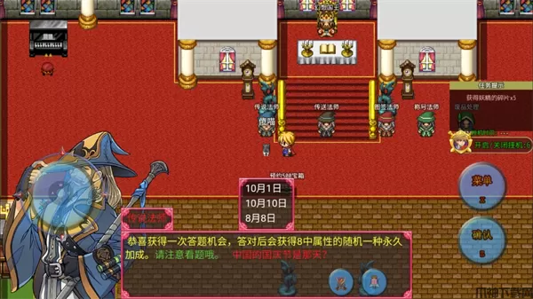 8、每通过一个副本关卡都会获得一次答题机会,玩家可以找到传说法师进行答题,答对之后随机获得一个永久属性加成。