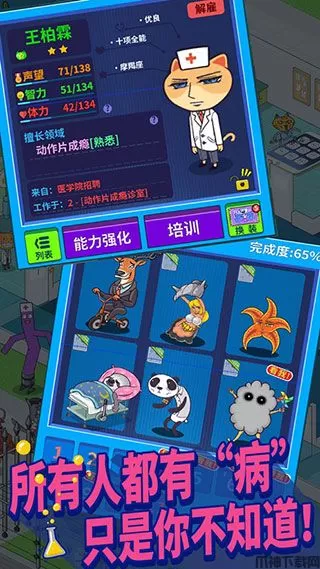 超脱力医院游戏中你会看到迎风狂舞的门前吉祥物、对片狂撸的斯文狼、洗剪吹箱猫三人组等等看上去设计很不合理但是又有所隐喻的造型设计。游戏的整体画面风格也给玩家一种干净整洁的感觉,在这些精神病人来来往往的场景下给人一种十分热闹的感觉。而既然超脱力医院是一款经营养成类手游,那么自然会有其经营养成的体系和玩法,其中医生的招募和培训就是游戏中的养成核心玩法。此外,超脱力医院游戏画面采用2D卡通风格展现,画面的清晰度很高且色调搭配合理,能让玩家在视觉上觉得很舒服。而且在音乐方面的表现同样很有意思,鬼畜风格的电音BGM与无厘头的画面有着很高的契合度,更加凸显出了游戏有趣的特质。