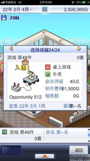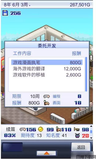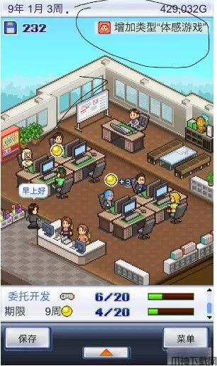 第一步:先准备好最强力的职员企划新的游戏,如果有一个趣味性、独创性、画面、音乐四个属性都很高并且得分超过32分的游戏更好,这样子我们可以制作续集,一般来说续集的开发都会比较顺利而且属性更高。