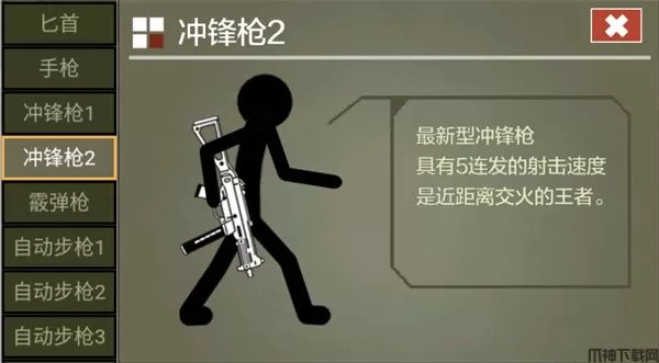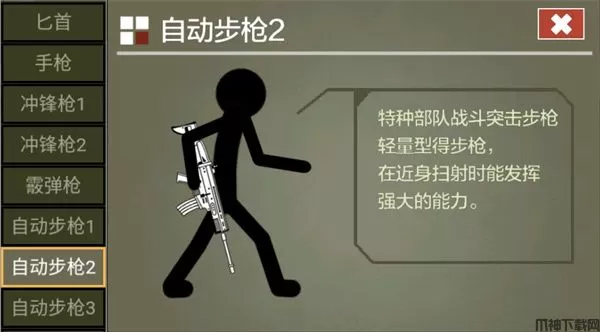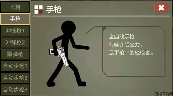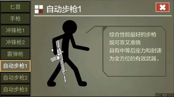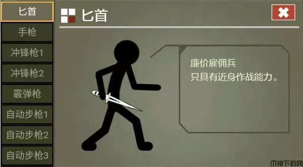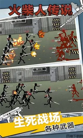 火柴人传说拥有各种不同种类的火柴人,而这些火柴人都有着不一样的武器,匕首、手枪、冲锋枪,更有霰弹枪、自动步枪、连发狙击枪、单发狙击枪、重型狙击枪、加特林、迫击炮、火箭筒、坦克、装甲车……各式各样的现代化武器层出不穷,不过都要玩家一一解锁哦!而且,在火柴人传说游戏的前期只有一种使用冷兵器的火柴人,当渡过前期关卡获得一定的金币以后才会解锁余下的兵种卡,进行闯关模式时并不是一味买贵的兵种就能轻松赢得胜利,在这款游戏里面一定的策略还是必不可少的,不同兵种都会有克制关系哦!感兴趣的朋友欢迎下载体验。