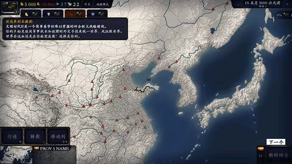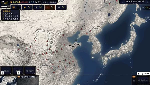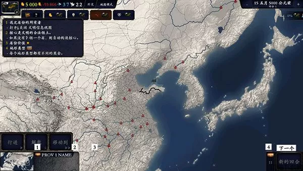 七、底部面板还有3处重要信息:1迷你地图;2所选省份的信息;3结束回合或继续。当你发出回合内的所有指令后,就可以点击右下角按钮结束本回合。