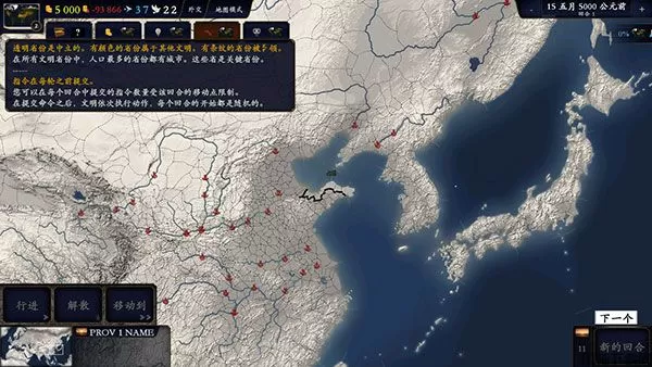 四、透明省份是中立的。有颜色的省份属于其他文明。有条纹的省份被占领。在所有文明省份中,人口最多的省份都有城市。这些省是关键省份。指令在每轮之前提交。您可以在每个回合中提交的指令数量受该回合的移动点限制。在提交命令之后,文明依次执行动作,每个回合的开始都是随机的。