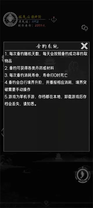 通过基础介绍可以知道,目前版本,每次垂钓会可以获得各种丹药或材料,垂钓消耗寿命,寿命归零就死了,坐化了,原地爆炸了,重新来过吧~