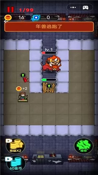 1、年兽挠门升级,所以前期不要让它一直挠门,不然升了级就扛不住了,挠门就建炮塔轰它。