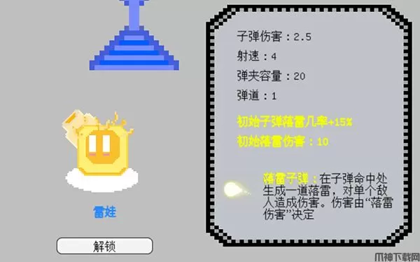 需要675金币解锁,发射的子弹有几率引发落雷,造成伤害,子弹伤害偏低,但容量非常大。