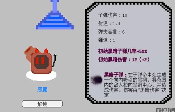 需要5000金币解锁,有几率发射黑暗子弹,命中敌人后会生成一个黑洞,将敌人吸引并造成伤害。