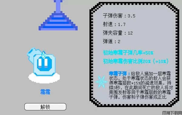 需要3500金币解锁,有几率发射寒霜子弹,给敌人施加一层寒霜状态,造成减速效果并造成等比伤害。