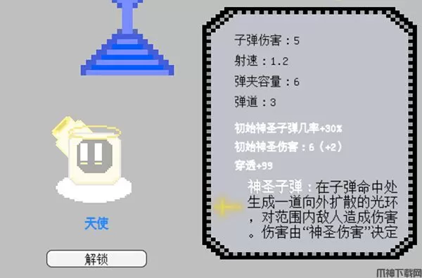 需要7000金币解锁,有几率发射神圣子弹,命中敌人后会形成向外扩散的光环,对触碰到的敌人造成伤害,还会增加99穿透属性。