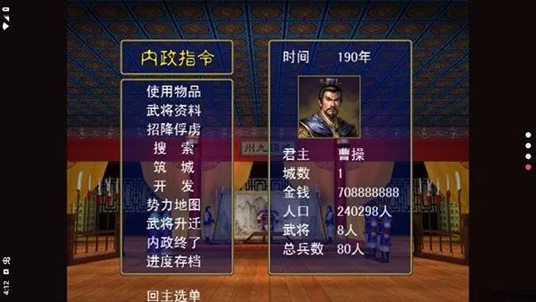 3、游戏刚进去就可以查看当前年代以及手下的武将和士兵,还有招降,筑城,开发等功能。