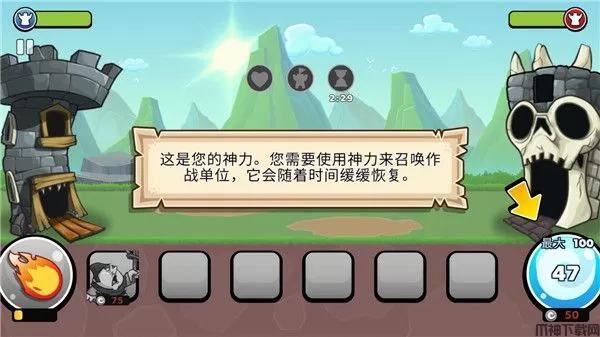 2、首先了解游戏基本操作,如下图所示:箭头指示为您的神力,您需要使用神力来召唤作战单位,它会随着时间缓缓恢复