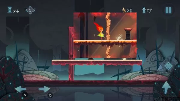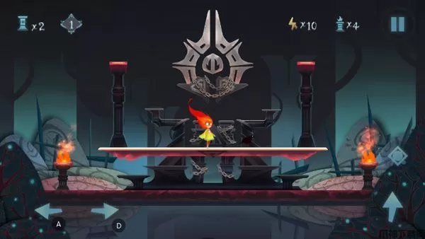玩家先左右移动,经过左右两边火炬将其点亮;再点击右边的正方形按钮,是中间出现红色区域,从旁边的阶梯出跳跃上去,到达红色区域阶梯处,将最上面两个灯点亮,按住跳跃,跳过去即可。
