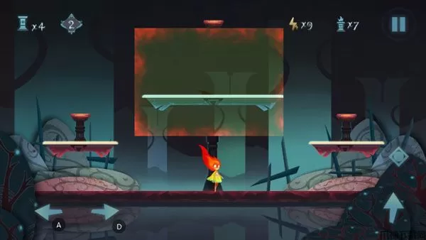 首先我们可以先按住右边屏幕那个菱形按钮打开红色隐藏区域,在屏幕中间向左滑动,会发现隐藏在屏幕左边的灯台,接着按住控制键跳上平台去点燃它们;同理,右边灯台也是这样点燃的。除此之外,一定不要忘记,屏幕中间最高点还有一个灯台哦!可以借助点燃第一个灯台的平台跳上去点燃就可以啦!