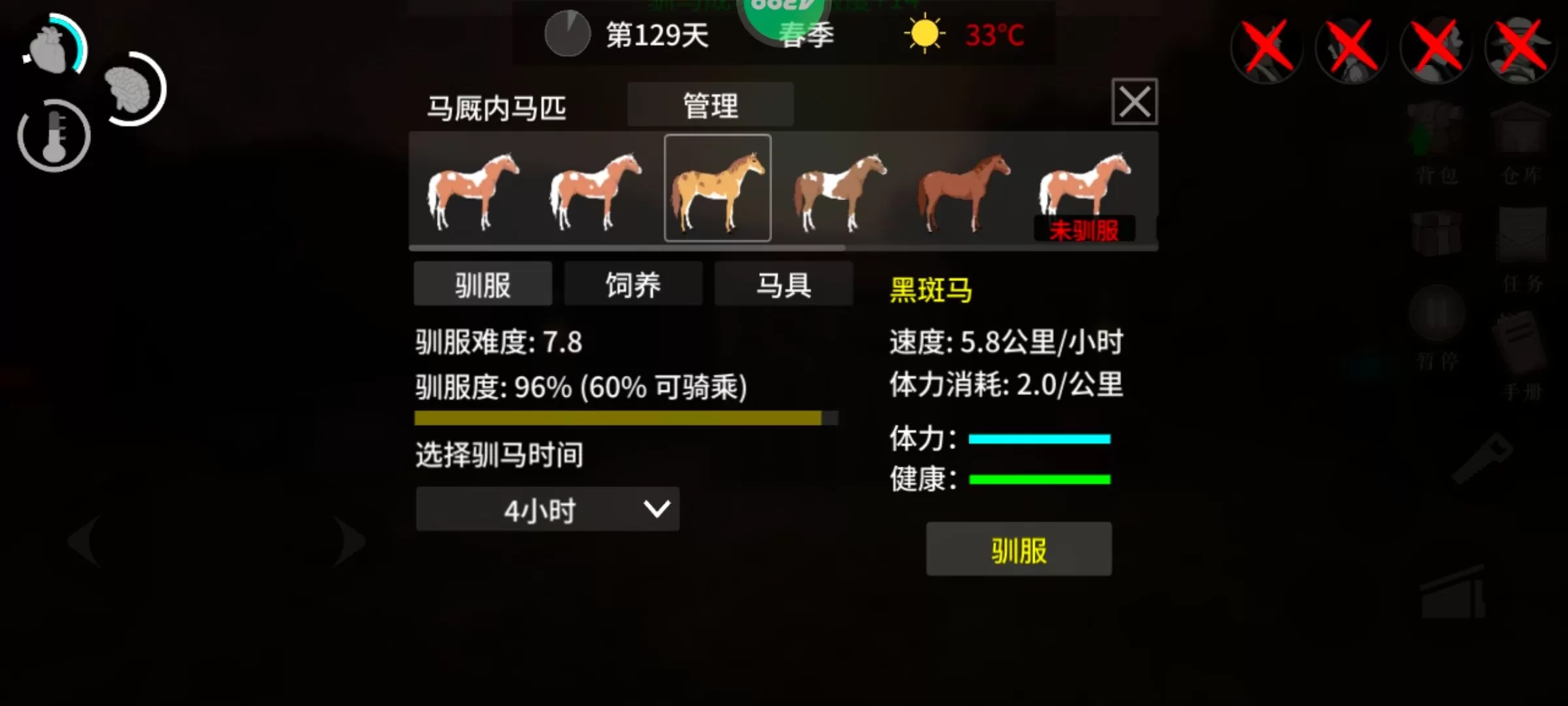 白鬃马跑得最快,初始是10公里每小时,穿装备可以加速。