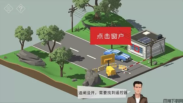 3、道路被道闸拦住了,需要前往安保房子寻找遥控器,点击窗户。