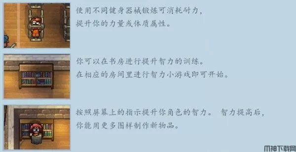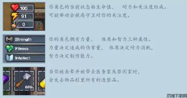6、血量为零后会躺倒床上,可以通过睡觉恢复体力和精力。通过吃饭和洗澡也可以很快恢复精力。