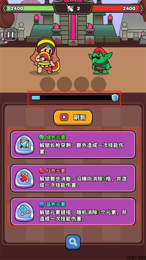 4、当相同元素消除到一定数量后会出现特殊的方块,消除特殊方块可召唤同类型的英雄进行攻击;