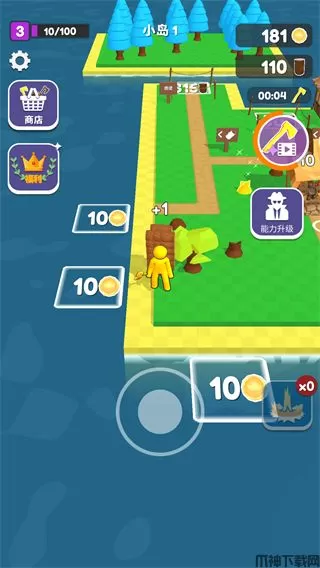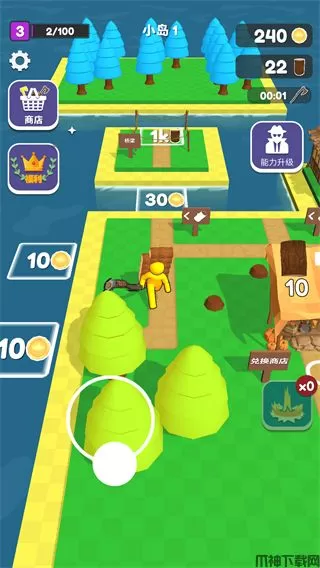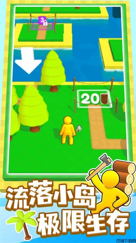 1、玩家使用拇指滑动,控制小人移动,砍伐木材,扩张,探索小岛。
