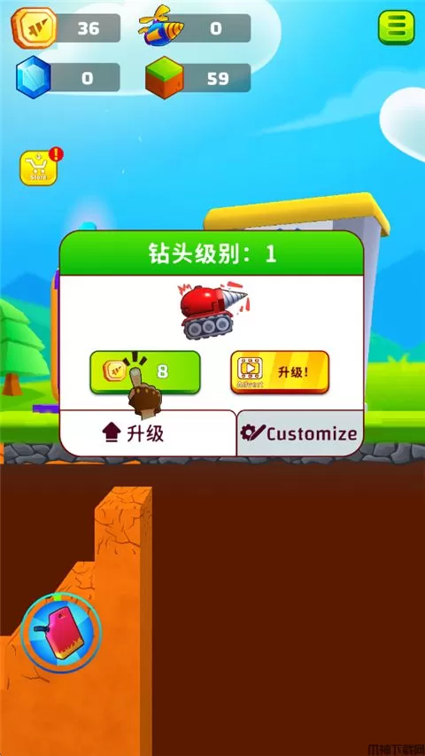 4、升级您的钻头零件(轮子、油箱、钻头尺寸、铲子、挖掘机……),以便挖得更深!
