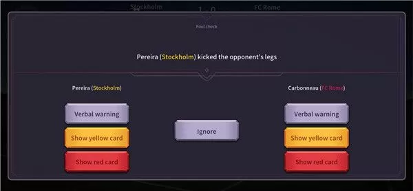 7、球员在比赛中犯规,我们需要选择对其进行口头警告或者黄牌红牌,当然你也可以点击ignore选择忽视