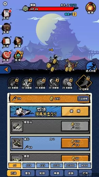 刀法升段:从1000关开始,每间隔100关首次通关可获得刀法残卷