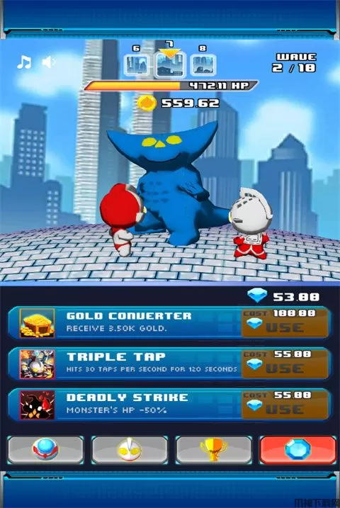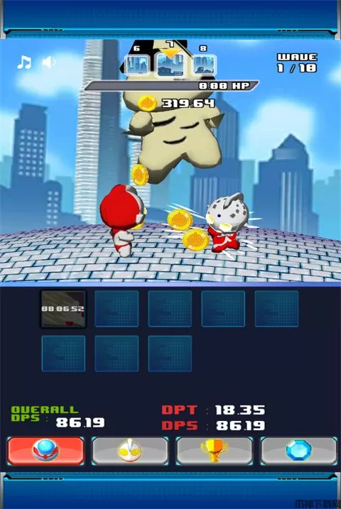 1、双击打开奥特曼兄弟联手游戏后,只要点击屏幕,画面中的怪兽就会受到攻击,怪兽上方的黄色血条就是怪物的血量;