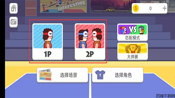 2、可以选择单人还是双人,选择场景和角色,并且可以选择模式,点击“2P”双人模式;