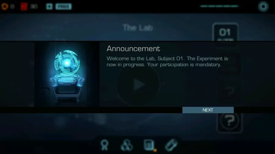 欢迎来到实验室,一号。项目正在实验中。您的参与是被强制的。(这句话把主角的背景说出来了,主角被抓后进入实验室进行实验)