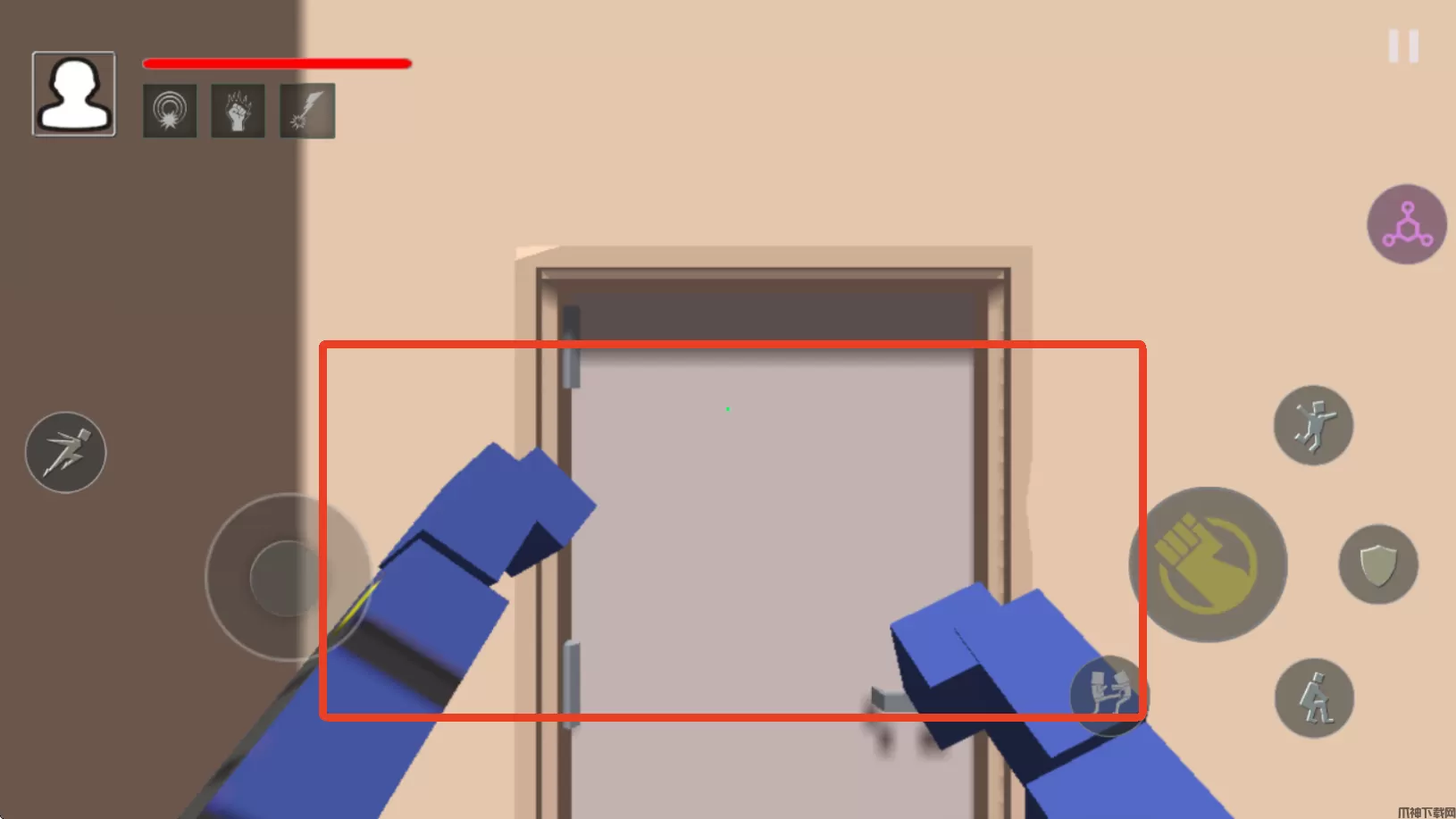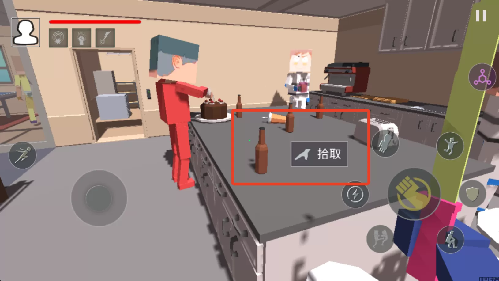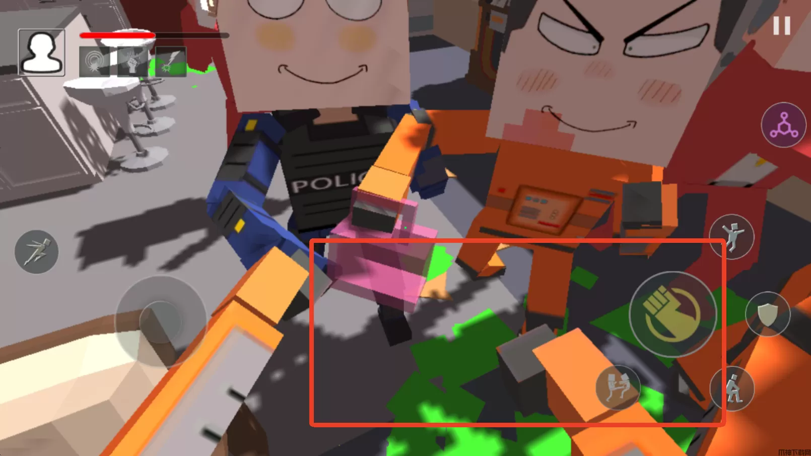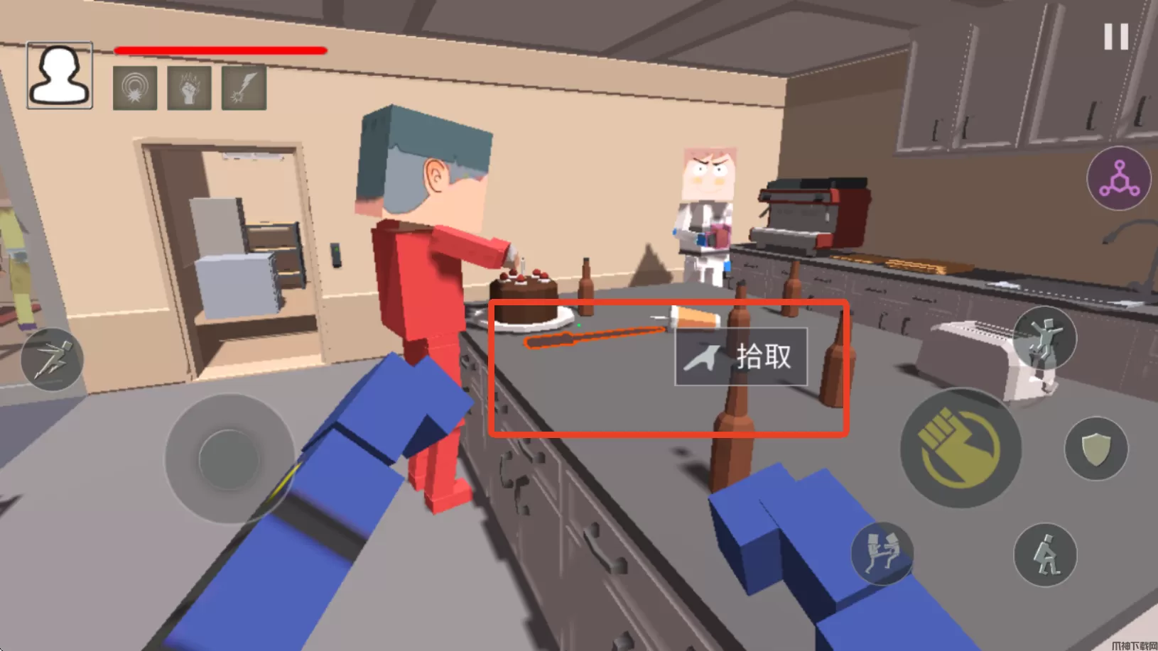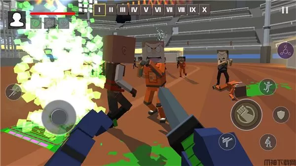 血染小镇手机版是一款采用第一人称的动作对战手游,你将成为一个方块人与其他人对战,刚进入游戏时手上是没有武器的,不过你可以向其他NPC挥拳发起攻击。当你攻击了某个NPC时其他NPC就会把你围起来向你发起进攻或者互殴,需要快速在场景内找到不同的道具为你所用,木棍、刀子或者木板,任何可以拾取的物品都能成为你的武器!