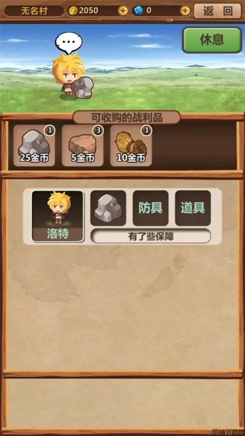 游戏中玩家扮演村长的角色,需要培养冒险者成长来打败魔王。具体玩法就是派遣冒险者去打副本,然后低价回收战利品,又高价卖出给冒险者,继续打副本赚钱,离线状态下冒险者也可以打工赚金币。游戏中每隔一段时间会有收破烂的奸商,价格浮动,看准了卖高价粑粑,石头,木头给他就行了;