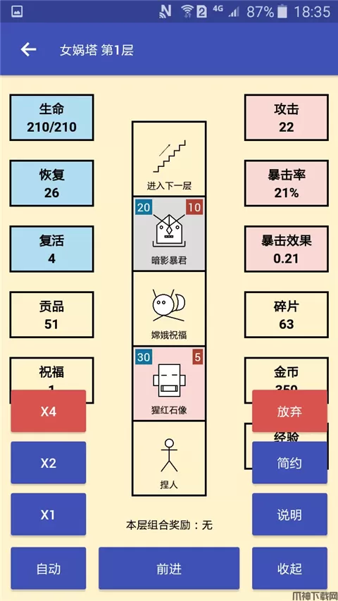 女娲捏人官方版中,玩家每前进一层,怪物的生命和攻击力都将提高,若玩家此次爬塔失败,则这一趟得到的金币会转化成经验,让玩家进行捏人,提高攻击力、生命值、恢复力、暴击率等属性,然后可以再次开始爬塔。