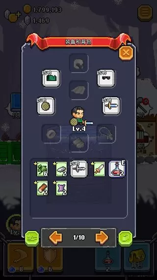我们点击右下方“背包”后会出现一个角色总览界面,在上方是我们“英雄”的全身配置,蕉君看了一下,装备配置设置挺齐全的,大到武器装备,小到手环项链。当我们获得新的武器装备后就可以在背包界面进行点击替换,从而装备上新的武器提升我们的攻击力,不过千万不要像蕉君这样连项链都没的“英雄”。在下方会有一排排物品,这就是我们在实战之中打怪获得的物品,其中有可以升级武器的材料,我们也可以把不需要的物品进行出售获得金币。