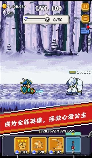 全能英雄(Idle Might Hero)是一款非常好玩的横版像素闯关角色养成类游戏,由柠檬酱工作室和Jampot联合出品。游戏以大魔王抓走了主角喜欢公主,主人公毅然的独自一人踏上了挑战魔王的旅途而主题展开。玩家将扮演拯救公主的英雄,并且拿起武器和路途上的怪物们激烈的战斗,消灭沿途中各种各样的敌人和怪物。玩家可以在全能英雄游戏中体验闯关玩法的乐趣。而且设定了诸多有趣的角色养成内容其中独特半放置操作玩法,不仅简化了玩家的操作,而且还为玩家朋友们提供更加刺激的游戏体验。另外还有丰富的关卡设计,多功能的技能组合,神秘的boss等你消灭,多元化的剧情内容能够让玩家更加的熟悉,对于玩家的战斗提供了一个很好的帮助。除此之外,在全能英雄中战斗中辅助道具还是需要玩家手动去操作释放的,需要注意的是技能和道具使用后都会有冷却时间,而技能的释放还需消耗一定魔法值。所以这款游戏对于玩家在战场的把控还是具有一定难度的,而想要成为全能英雄还是需要付出一定的努力的,所以你能成为一名全能型的英雄并打败魔王拯救公主么?那就来下载试试吧。
