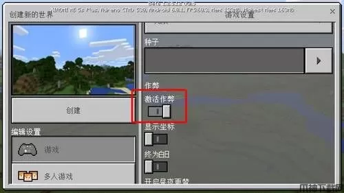 1、首先需要在游戏开始前开启作弊功能,在创建新的世界的游戏设置中找到作弊相关选项,将激活作弊按钮开启,再点击创建游戏进入游戏。