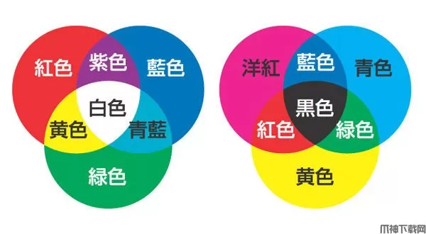 左侧为色光的三原色,右侧为美术的三原色。