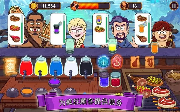调配药剂饮品的过程很简单,没有复杂的原料采集,也不用特别烘焙制作等待,玩家只需要在规定的时间范围内完成任务即可,像是烤蜥蜴小吃这些,刚开始就可以预算好来,先烤着一份,饮料瓶也可以先装好一杯饮品,错了倒掉就可以,但是要注意浪费要有度,不然钱赚不够就赔大了。当然如果你出色完成任务,会有2倍的金币奖励喔,刚开始虽然轻松,但随着等级的提升,游戏难度也会随之增长,为了让难度变大,除了“红、黄、蓝”这三种基础饮品外,还需要你通过加法来调出其他颜色——橙、紫、绿或棕色等。经营过程中会出现“特别顾客”,相当于美食家一角,给你增加难题,像是市长 Polly T. Sean 和勘探者 Boar O'Mear都会偶尔光临你的酒馆。