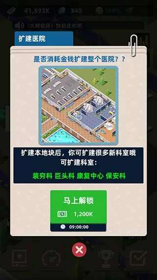 8、升级自己的医院,然后合理布局,解决各种问题,扩大医院规模,成为超级大亨。