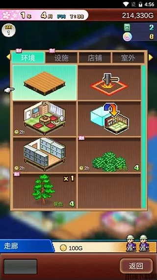 进入游戏后,玩家首先看到的是已经安置好的温泉、和式房间、自动贩卖机、前台和两棵松树。空地,即可建设面积其实并不大,但是对囊中羞涩的各位新手来说已经足够了。