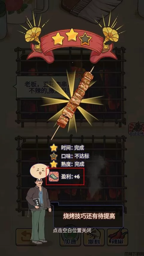 3、之后就可以制作美味烤串啦,玩家需要根据烤串下方进度条,合理调整速度,添加调料。