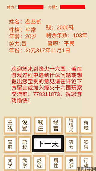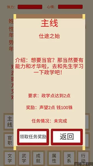 心情与体力:每手动点下一天扣1点体力与心情,数值归零角色死亡。商城流逝丹不扣除数值。
