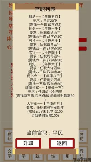 从县令到大将军总共8个职阶,四维过百可任职大将军。从骠骑将军开始,职权从文官转为武将,操作的时候不需要对职权界面费太多时间,满足任务需求可以不再理会。
