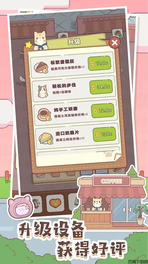 通过升级设备和员工,你可以吸引更多的猫咪顾客,提高盈利能力,成为猫咪界的美食大亨!