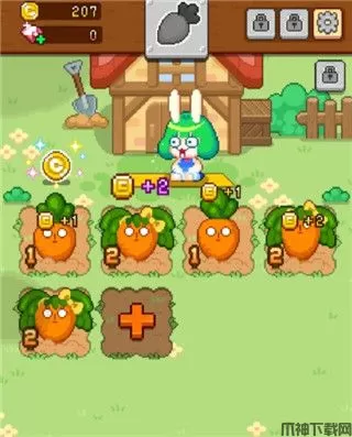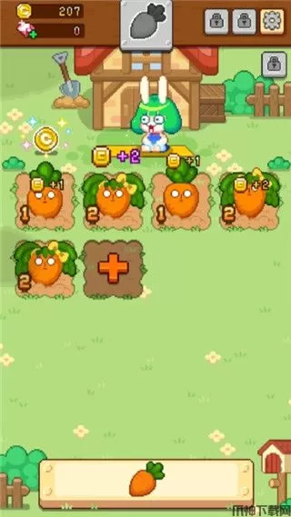 1、游戏的耕种作很简单,玩家只要持续点击就可让红萝卜长出来,接着只要拖曳相同等级的红萝卜进行合成就可进化为新品种的红萝卜。而等级越高的红萝卜,获得的金币量也会越多。而玩家如果种累了也可以放置让红萝卜持续获得金币。赚来的金币可用来扩张土地,有时也可以直接购买收成过的红萝卜来进行合成,也可以购买新的农场喔。